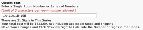 According to the International Building Code (IBC), areas of refuge are required when a building is not equipped with an automatic sprinkler system. Please  Contact Us if you need assistance with determining whether or not your building needs an area of refuge.  General Questions Q: Where do my signs go? How do I install them?  ANSWER: If you are using our SignSpec© Signage Planning Service, your signs will arrive labeled with location numbers that correspond to your Sign Location Plan, so you don't have to worry about which signs go where. You will also receive a  Sign Installation Guide providing detailed instructions on how to install your signs according to ADA specifications.  Q: Where are your  products made?  ANSWER: All products are produced in the USA at one of our manufacturing facilities. We use the highest quality materials to ensure complete satisfaction. Q: Are changeable common room signs available?  ANSWER: Yes, and they have a removable insert for easy updating. How to Customize My Signs Q: What text should I use on my sign?  ANSWER: Always remember to use easy-to-understand and recognizable words, like the common name of the room or its function. Avoid slang or trendy words. Also, remember to keep the message short and simple. Long messages tend to lose their impact, while multiple lines can be hard to read. Q: How do I enter a series for room numbers?  ANSWER: Enter series of numbers with a dash (ex: 1-10) or use commas to separate individual numbers (ex: 1, 10, 35). Room numbers can be combined as well (ex: 1-10, 12, 14, 16, 24-30). Please enter all room numbers needed in this style. You may also add a character prefix or suffix to a series (ex: 1A-10A, 2B-5B). Note that preview will only show the first item in the series.   Q: Can I use a combination of numbers and letters such as 23A or Room 33?  ANSWER: Yes, you may use any combination of characters on a sign. If ordering multiple room numbers, simply list the characters you would like on your sign as a series (ex: 1A-10A, 12A, 2B-5B). Note that the preview image will only show the first item in the series. Q: How do I enter arrows onto a sign?  ANSWER: For your convenience, you'll find a drop-down menu with arrows for your directional signage. If for some reason the drop-down arrows don't work, you may still have to use key strokes: