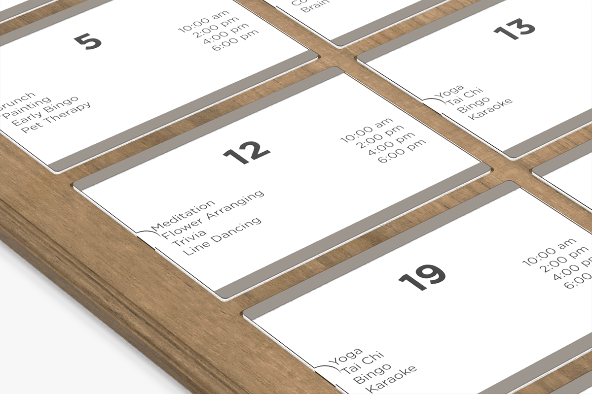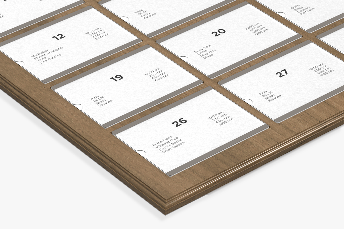 - Easy updating. Simply fold a printed 8.5" x 11" piece of paper in half and insert it in the slot designated for that day.