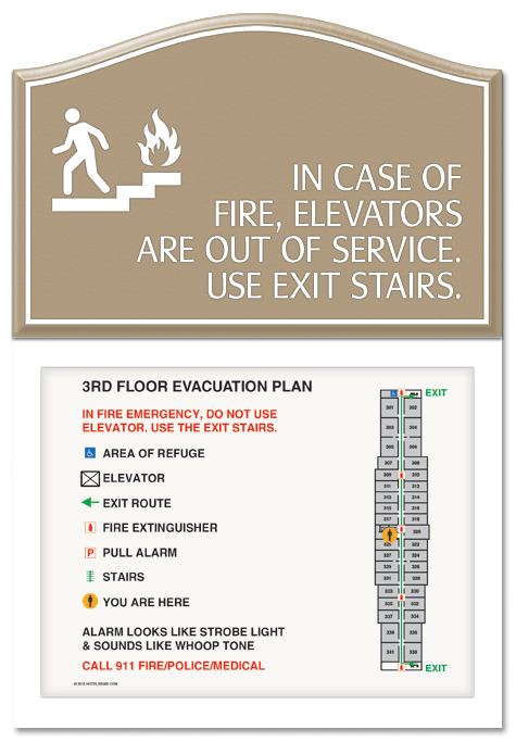 • Post adjacent to elevator call button with bottom edge of map no more than 48" above floor to instruct people to use the stairs in the event of an emergency, not the elevator.